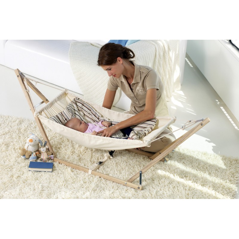 Stylish furniture and baby cradle in one.Hippo is a real eye-catcher and a proper stand made of untreated spruce wood for the baby hammocks Kaya natura and Kangoo (hammock not included).