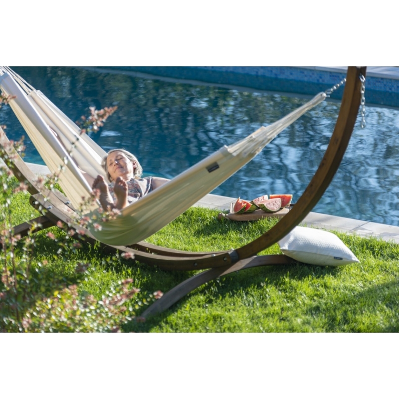 Dvivietis organinės medvilnės hamakas Modesta – taps itin unikalia detale, kuriant jūsų tvarius namus. Vienas ar poroje – patirkite tikrą atsipalaidavimo akimirką.